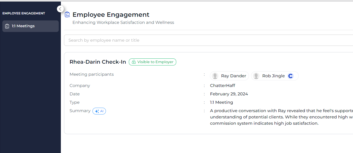 We've added the first iteration of an employee engagement/performance management module that focuses on 1:1s - we've already performed a few 1:1s with our team! Future additions here include the ability to push out surveys and pulses.